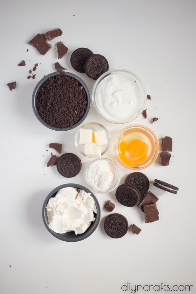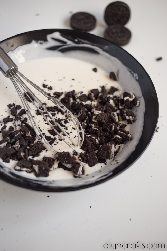 - Lower the temperature to 160 degrees C (320 F). Whisk cream cheese, flour, egg and sour cream together. Add crushed Oreos into the batter.